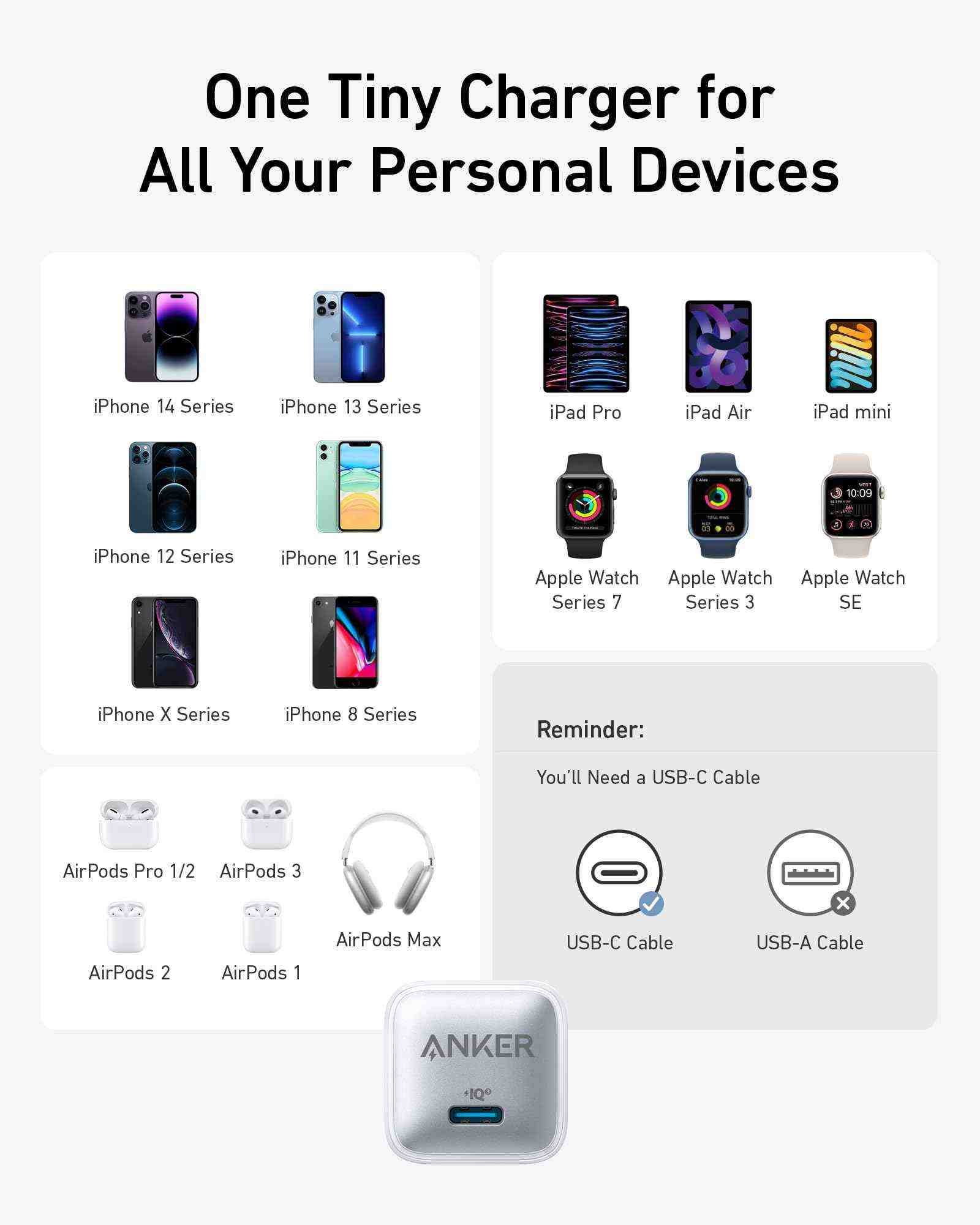 - What You Get: Anker Select Charger (20W), 5 ft USB-C to USB-C cable, welcome guide, 18-month warranty, and our friendly customer service.