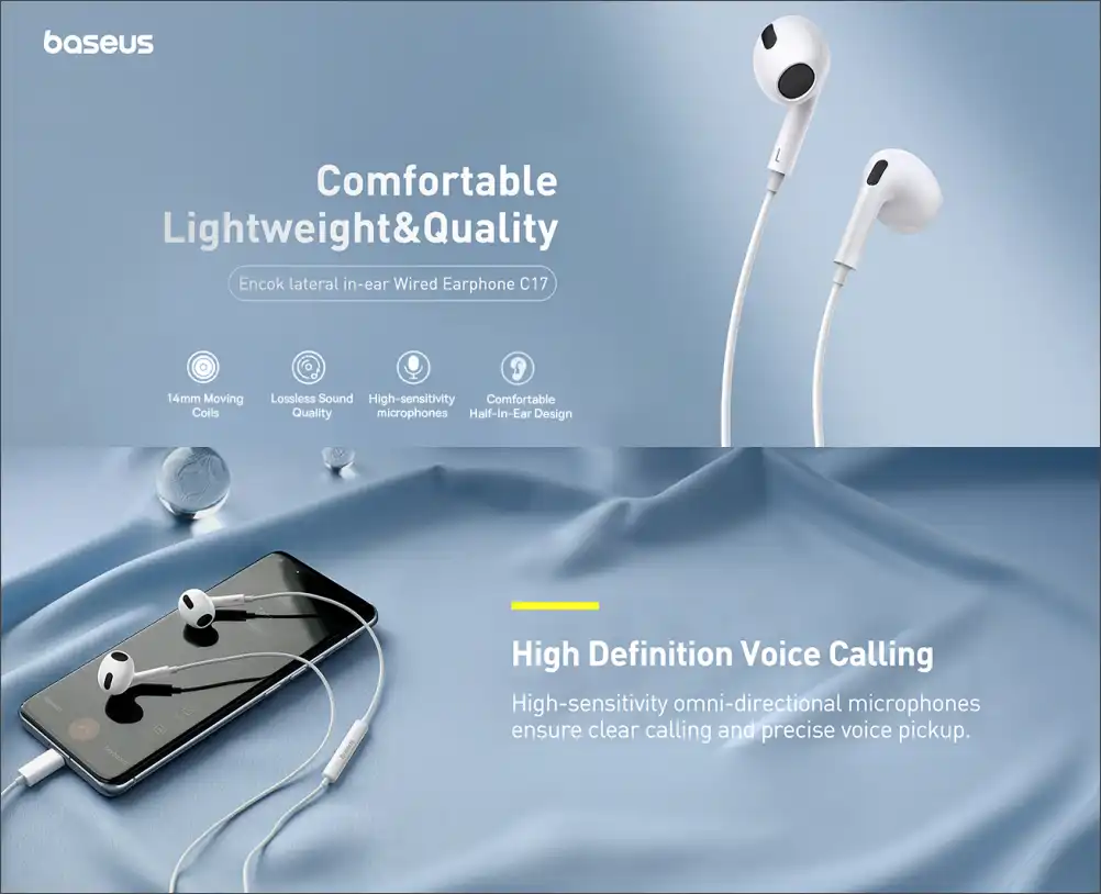- With the Baseus Encok H17 earphones, you can expect clear and balanced sound reproduction across a wide frequency range. The earphones feature high-quality drivers that deliver rich bass, detailed midrange, and crisp highs. Whether you’re listening to music, watching movies, or making calls, these earphones will provide a premium audio experience. The built-in microphone allows for hands-free calling, and the in-line remote control enables easy control of volume, playback, and call functions. The tangle-free cable ensures hassle-free usage and storage, making these earphones a convenient and reliable choice for everyday use.