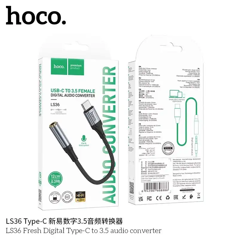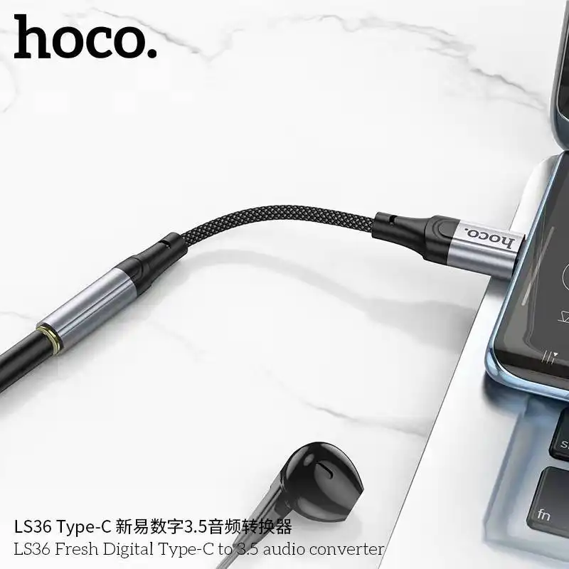 - This Hoco LS36 Digital Audio Converter connects your headset with a 3.5mm jack connection to a phone or tablet with a USB-C connection. The converter is made with a durable combination of metal connectors and a braided cable. You connect this adapter on one side to the USB-C port of a device such as a telephone or tablet and on the other side to a 3.5mm jack connection of, for example, your earphones or headset. With a compact length of 12cm, you can enjoy high-quality audio without delays. The built-in smart DAC chip ensures that the adapter is guaranteed to function on all USB-C devices and ensure sound quality. With this adapter you can connect a 3.5mm headset with microphone, where the microphone also works.